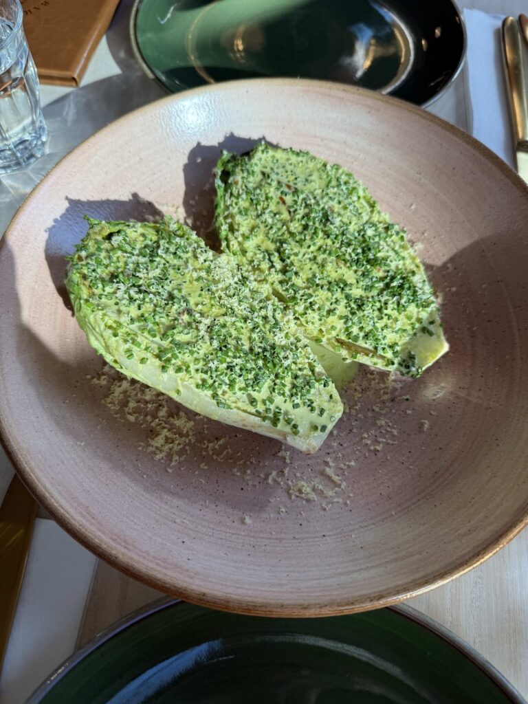 Asked about a signature dish, Gatschuff, without hesitation, said it was the first he conceptualized, and it’s still on the menu. Grilled baby gem salad features green goddess dressing, green chives and cured egg yolk.