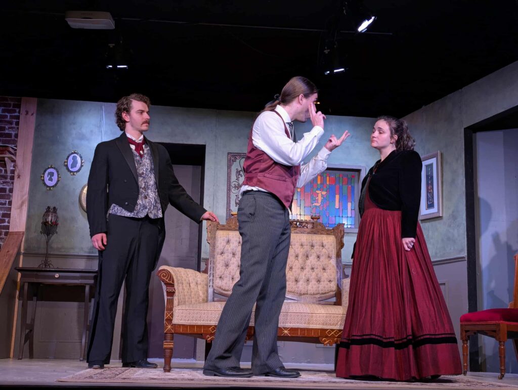 The set design is quite clever in this production, with the stage divided in half to form the upstairs laboratory on one side, with the downstairs sitting room forming the other. The actors take pains to delay their appearance in the new room when moving from place to place and make stair climbing noises to maintain the illusion of there being different floors in the house. The décor is well appointed and thoughtful. The lighting design is also quite wonderful, as there are windows in the lab and the sitting room that flicker realistically during a thunderstorm, and in one high-drama scene, orange light is used to show a space increasingly engulfed in flames. To demonstrate the use of electricity in animating Frankenstein’s monster, the lighting and props designers have come up with a really creative, eye-catching device. Well done, all.