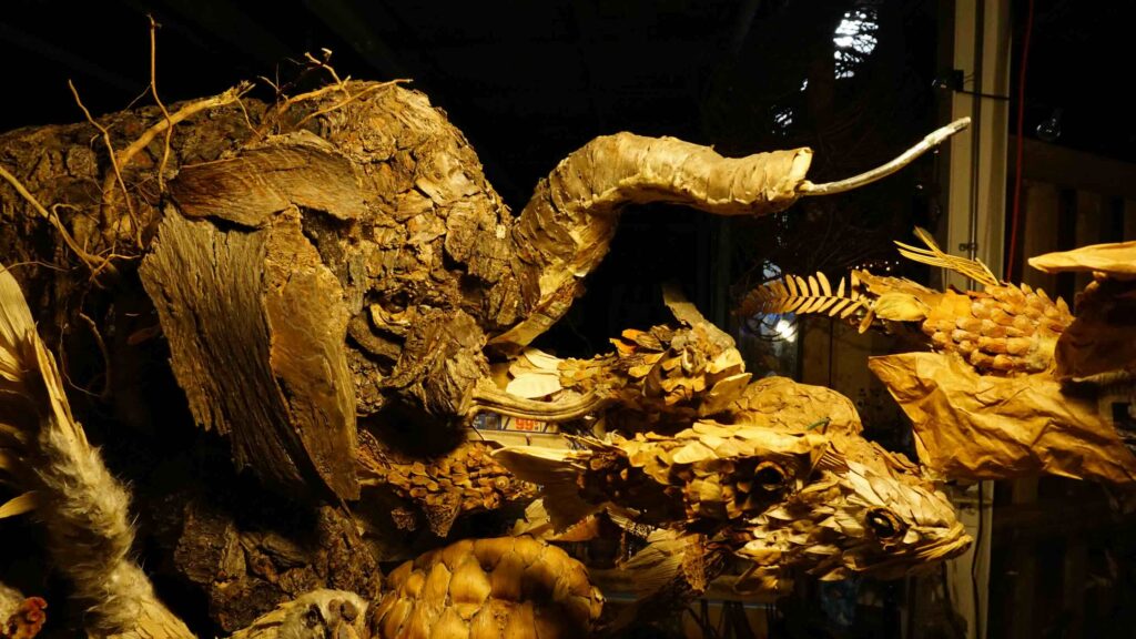 Mexican-Canadian sculptor, painter and accordion player CESAR CORREA CORDOBA is inspired by Indigenous art traditions from back home. The multidisciplinary artist sculpts uncanny animals and figures made from greenery, wood and reused resources, like twigs, bark, leaves, pinecones, fruit peels, and other natural materials.