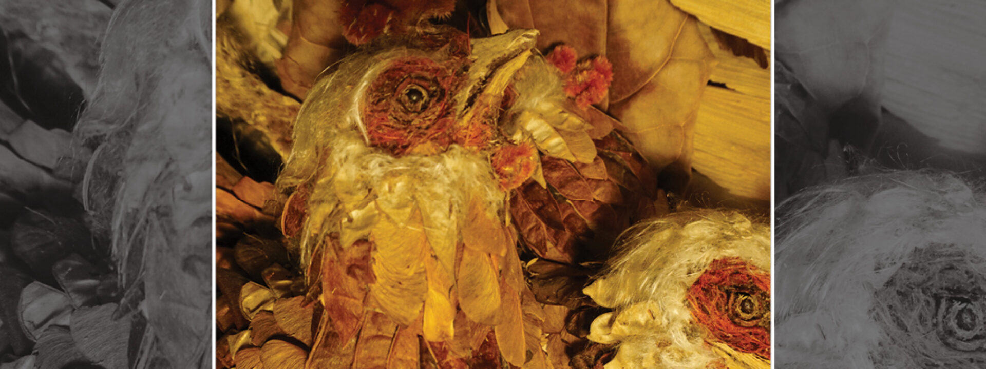 Mexican-Canadian sculptor, painter and accordion player CESAR CORREA CORDOBA is inspired by Indigenous art traditions from back home. The multidisciplinary artist sculpts uncanny animals and figures made from greenery, wood and reused resources, like twigs, bark, leaves, pinecones, fruit peels, and other natural materials.
