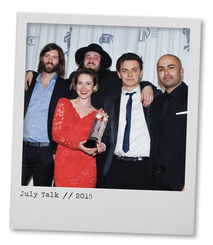 The funny story is that after July Talk won our first JUNO, Tim Oxford of Arkells and I went out for a smoke. On our way back into the venue, everyone was leaving and we passed the rest of Arkells on the escalator leaving the venue. Tim had missed the presentation of one of the big JUNOS they had just won. I felt bad but he thought it was kind of funny!”