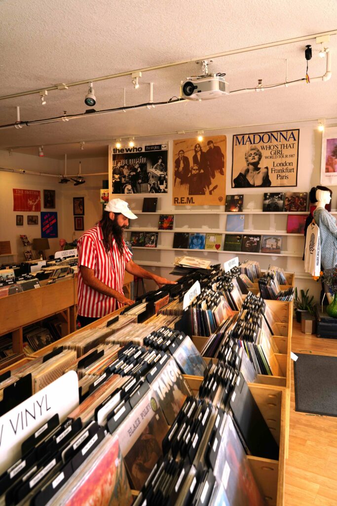 Step inside and you’ll find an eclectic mix of new and used vinyl, carefully chosen to span eras and styles – rock staples, deep-cut indie, international gems, and the kind of offbeat discoveries that keep crate-diggers coming back. Beyond the records, the shop carries vintage clothing and music merch, and hosts several live performances a month, along with pop-up events, and the occasional listening party that transforms the space into a mini-venue.