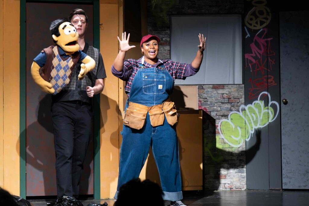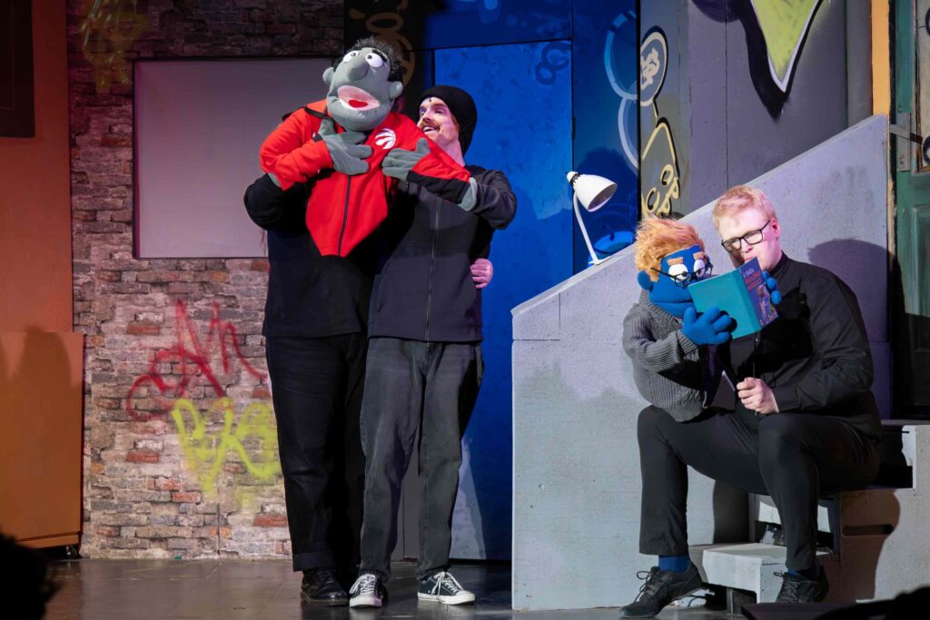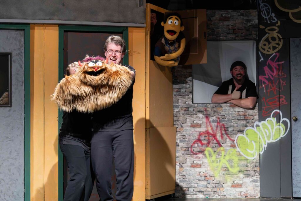 This production also has fantastic set design with clever detailing. Puppets add layers of jokes from the background of scenes, a TV screen adds digital silliness, and the characters pop in and out of colourful faux neighbourhood apartments that add movement and depth to the performance.
