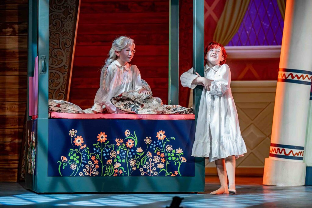 Of course, the heart of Frozen is the deep love and loyalty of sisters. That is sweetly depicted by Addison Wagman and Naomi McIntyre, who play Young Anna and Young Elsa respectively. Elsa is mature beyond her years and Anna is a precocious “tornado in pigtails,” which Wagman wonderfully encapsulates.