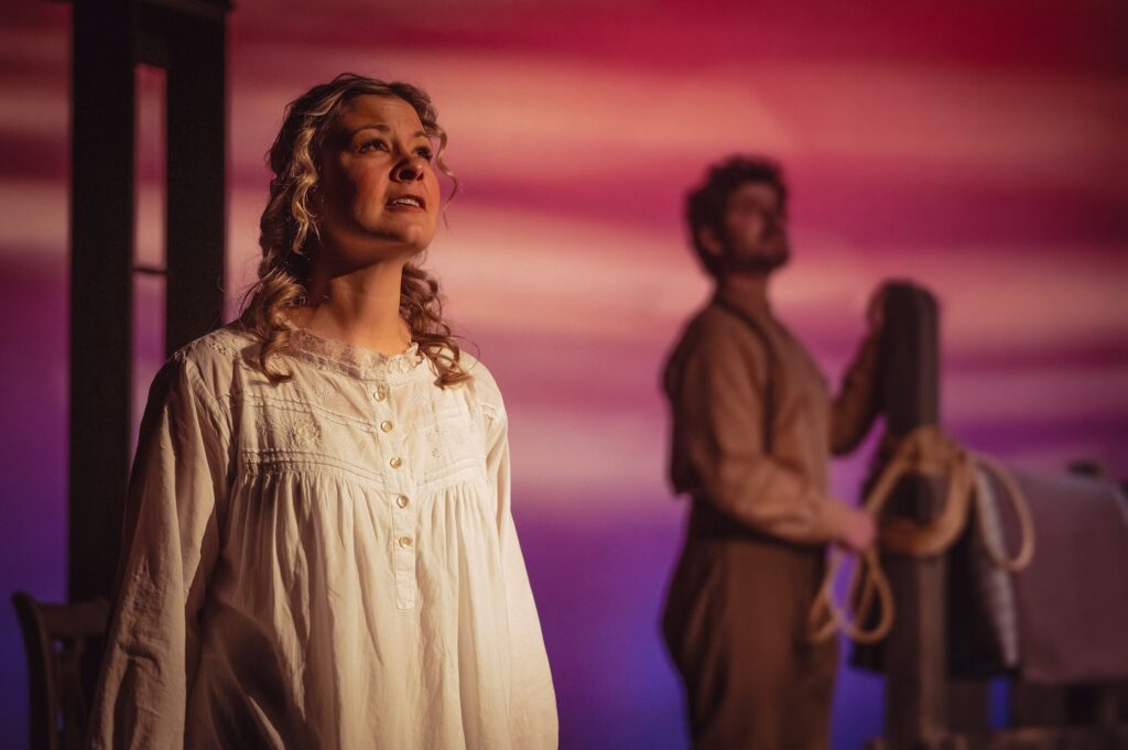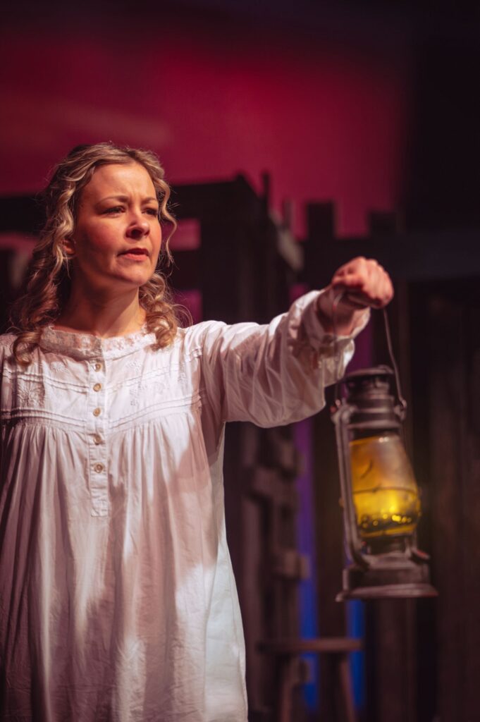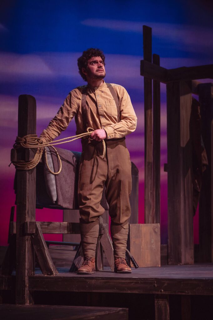 The set design at Theatre Burlington is extremely clever, evoking a rainswept field, a barn, a horseback ride, a meeting in town, a tea party and the frontlines, as Mary takes us through her memories, some springing from the letters Charlie sends her after he enlists and travels with Lord Strathcona’s Horse Regiment to England and then on to France. Through letters, Charlie tells Mary of his experiences as a soldier, including interactions with his superior officer, Sergeant (later Lieutenant) Flowerdew, also played (most remarkably) by Claire Sears. The war scenes culminate with the battle of Moreuil Wood, where Flowerdew pushes their mounted squadron past German machine guns. This is all from a set constructed mostly of planks of wood, rope, and sand bags.