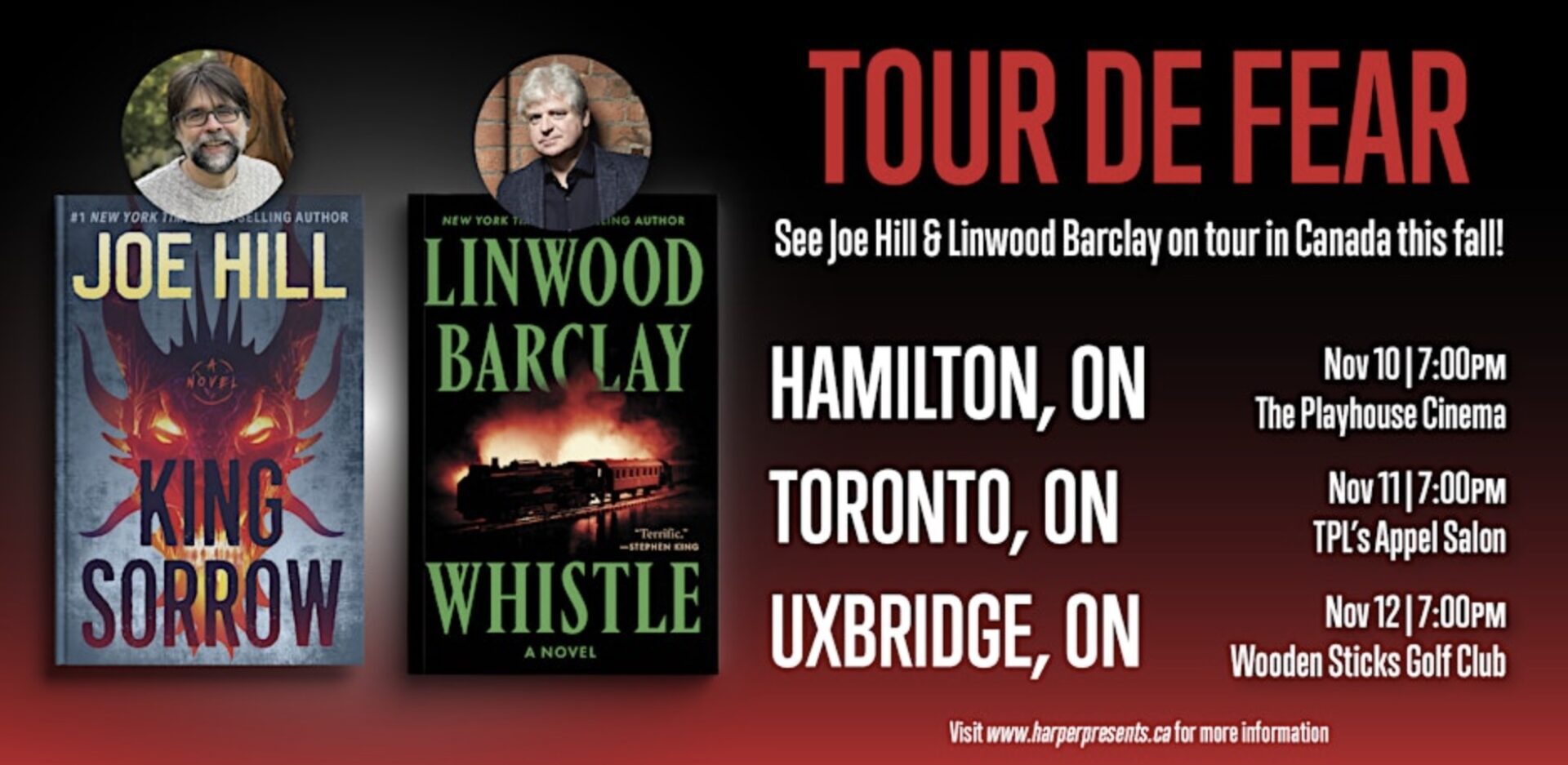 Hill will join Canadian thriller novelist Linwood Barclay at the Playhouse Cinema in Hamilton on Nov. 10, part of a three-stop Tour De Fear mini-tour. The two New York Times-bestselling authors will share their latest works with fans at an event hosted by gritLIT.